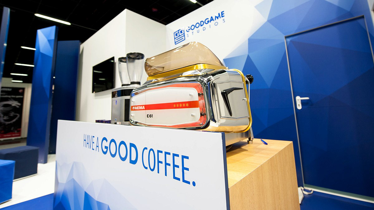 The front side follows this idea and the stand opens up. Steles on both sides allow visitors to sneak a peek at the what's going on the inside where screens with in-game videos and a playable demo on tablets offer a closer look at the game. Two rooms in the back, a coffee bar and some stools offer plenty of options for a talk with PR and the developers.